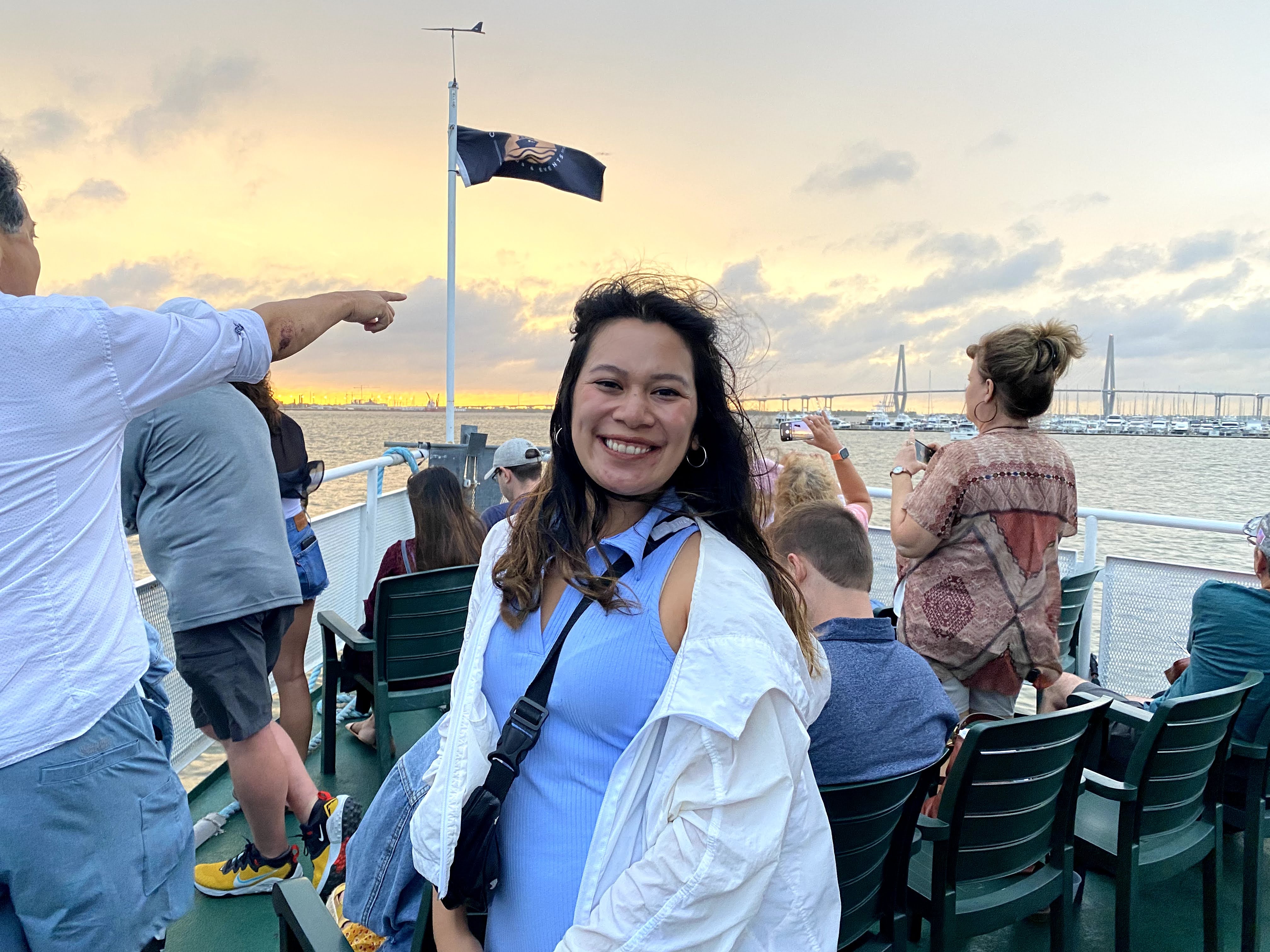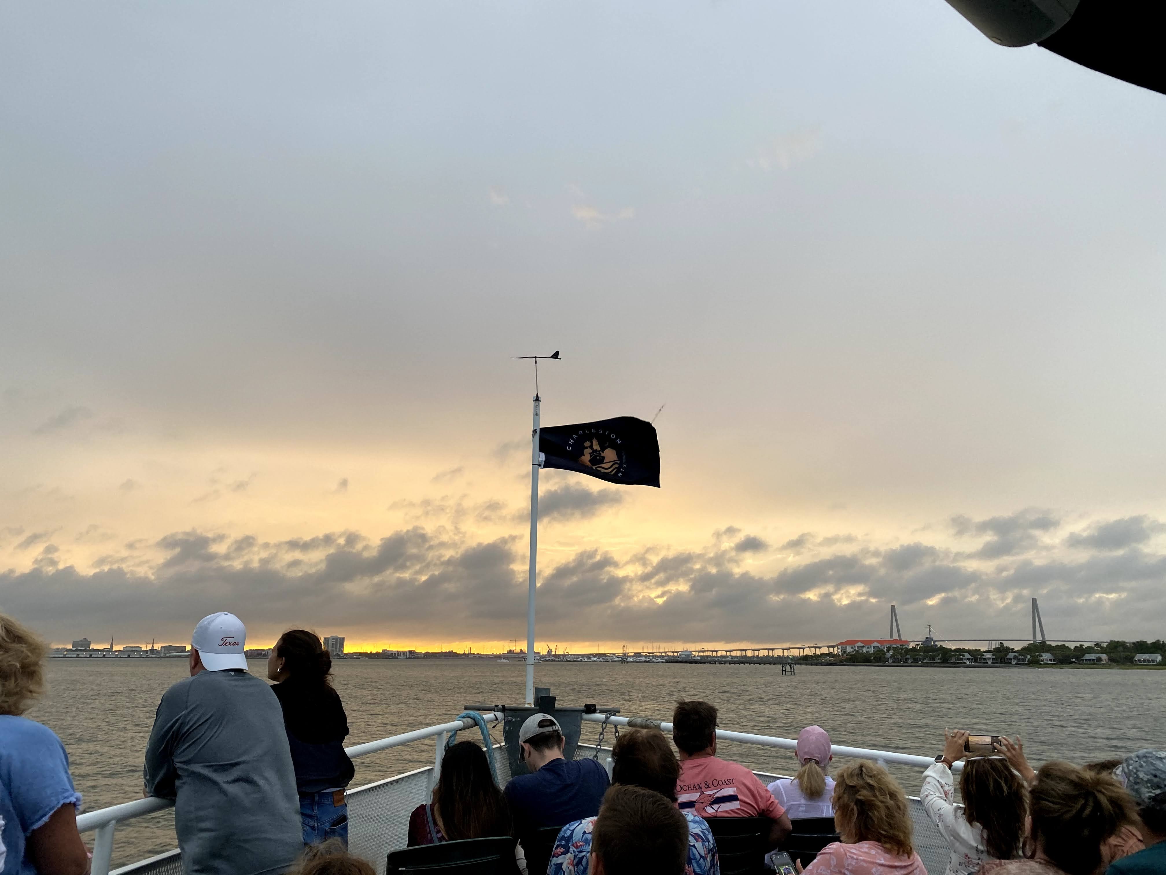 While Charleston is a fairly walkable city, I was running late to my sunset cruise. With Ubers being so expensive and sparse, I splurged for a lux so I could get there on time. Luckily when I arrived, there was a long line to get on the boat. Unfortunately for me, that meant I was not going to get a spot to sit on the boat. As a solo traveler, it’s typically pretty easy to snag a spot at a bar or restaurant. For a sunset cruise?? Maybe not so much. I ended up standing the whole time. Once I checked in, I beelined straight to the concession stands. They were serving drinks and snacks. I purchased a Rose can and found a spot on the side for the tour. The tour was about 90 minutes. We saw one dolphin!!! Not many other animals on the tour, but it was a nice relaxing evening to be on the water.